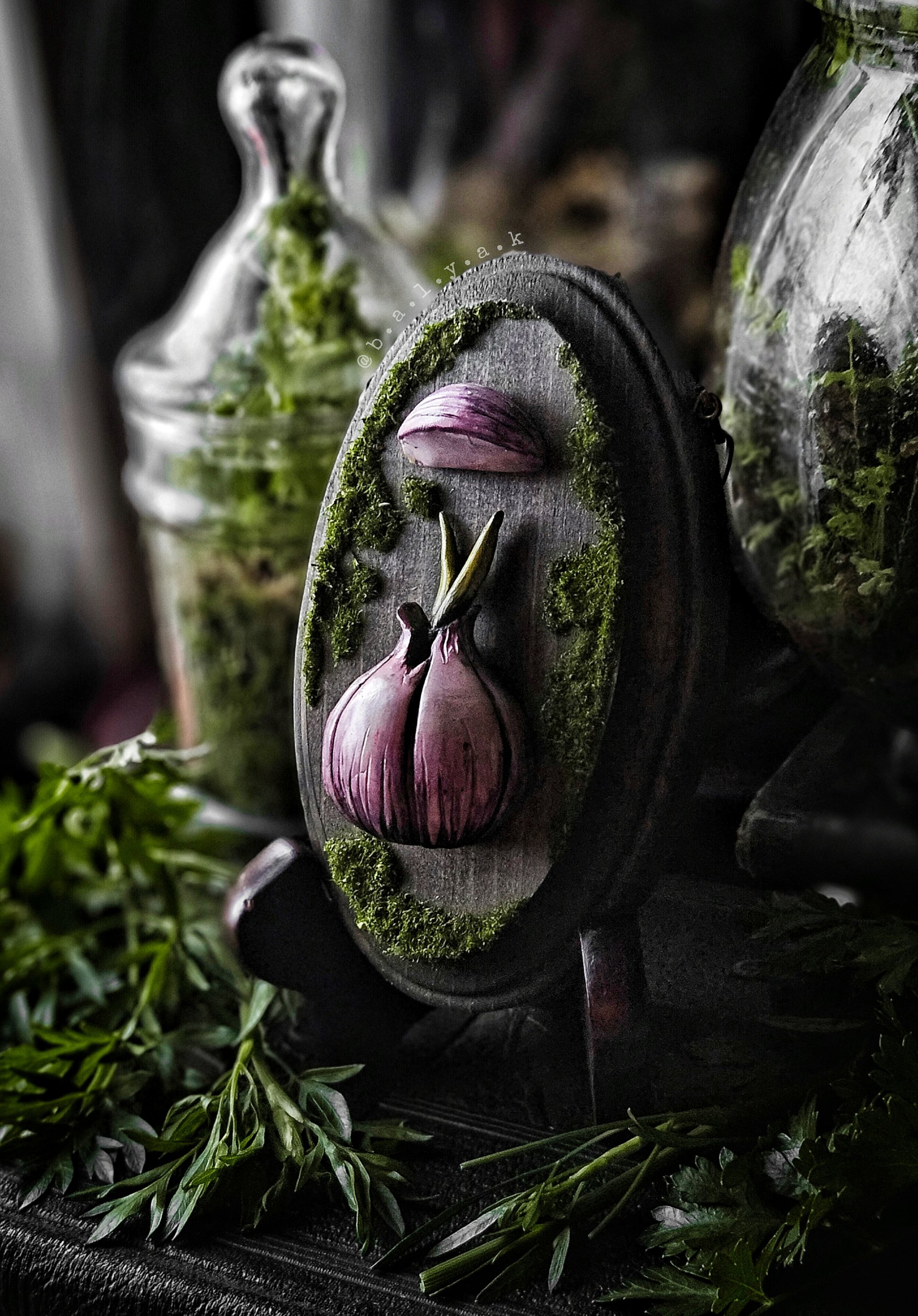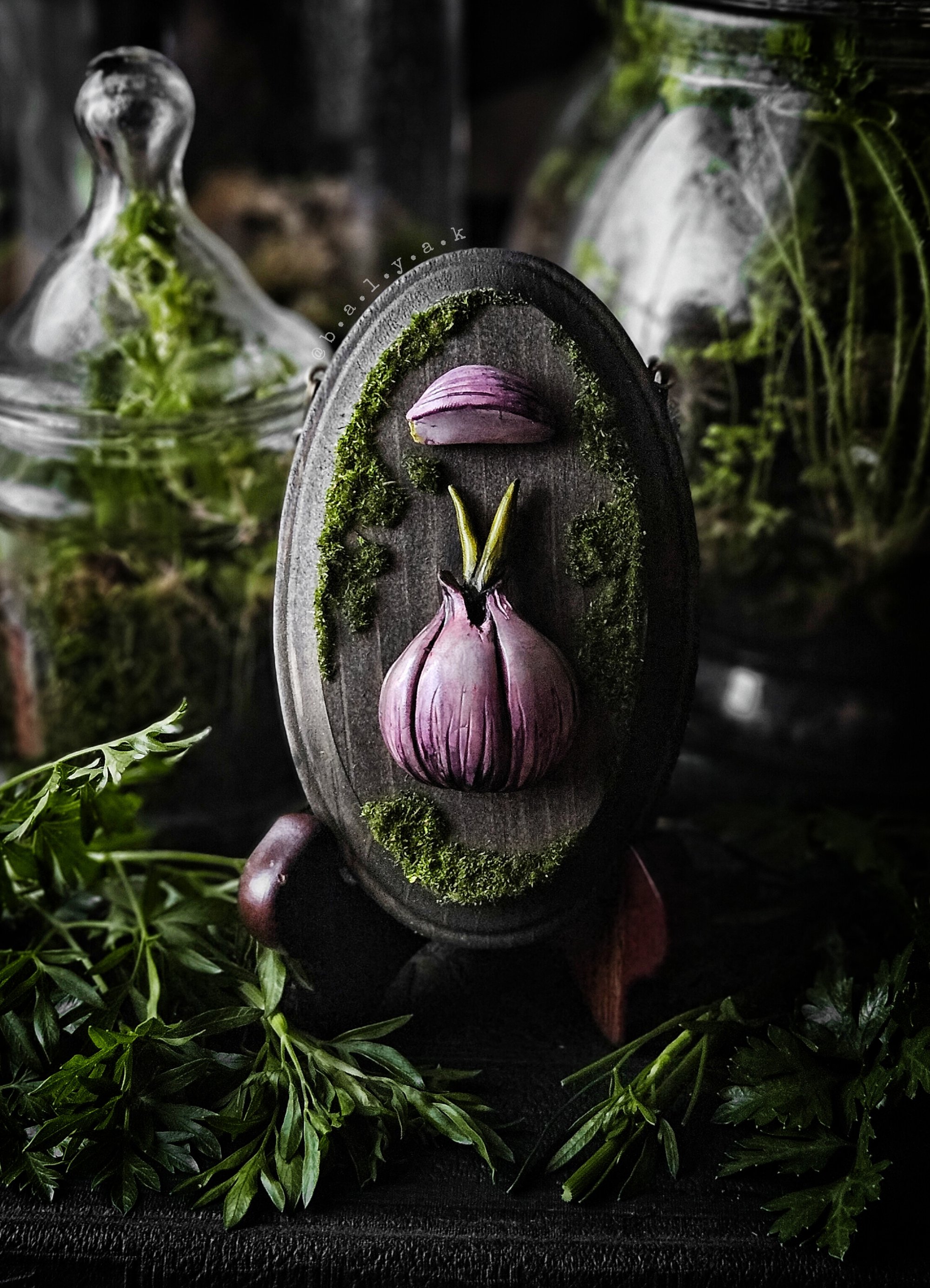 This small replica of a Garlic with it's clove- is perched on a small wooden plaque that is reminiscent of curated museum displays.